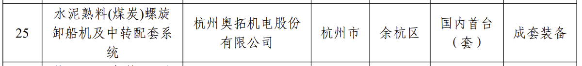 近日,杭州奥拓机电股份有限公司(以下简称“奥拓股份”)自主研发的“水泥熟料(煤炭)螺旋卸船机及中转配套系统”,成功获评国内首台(套)装备认定。该装备属于国家重点支持的高端装备产业领域,是港口物流中补短板、填空白的装备产品,通过浙江省机械工业联合会组织成果鉴定,鉴定委员会一致认为:“该成果技术难度大,创新性强,技术整体处国际先进水平,同意通过鉴定”。
