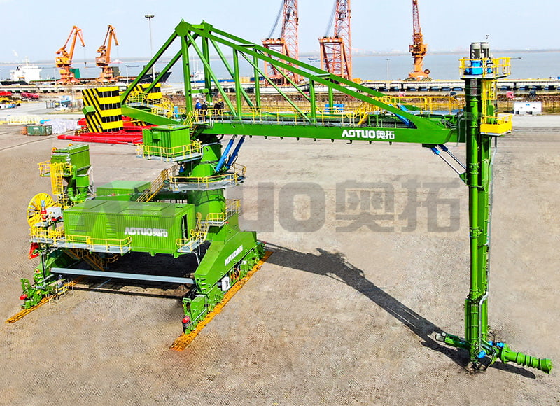 ATXL-B型螺旋卸船机可在码头轨道上纵向行走,机动性强。依靠回转塔双向水平旋转、塔上水平梁仰俯变幅、垂直臂前后摆动以及门机行走,取料器可实现三维运动跟踪物料位置取料,进而利用垂直螺旋机将物料提升至水平螺旋机,再通过出料装置自动将船仓内物料卸载到岸上的输送系统。